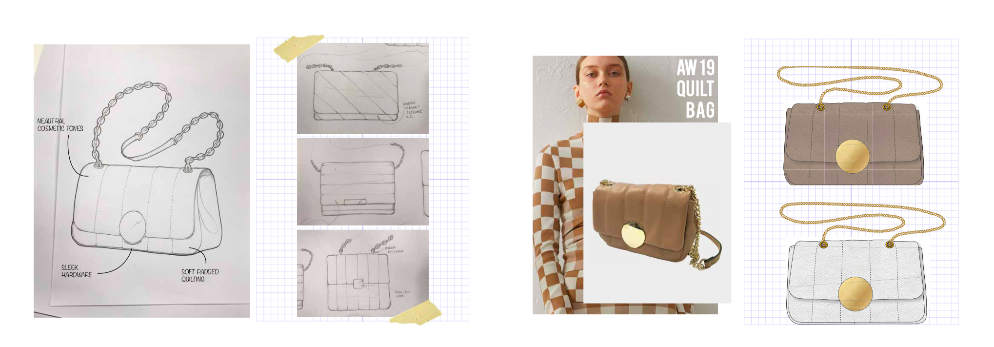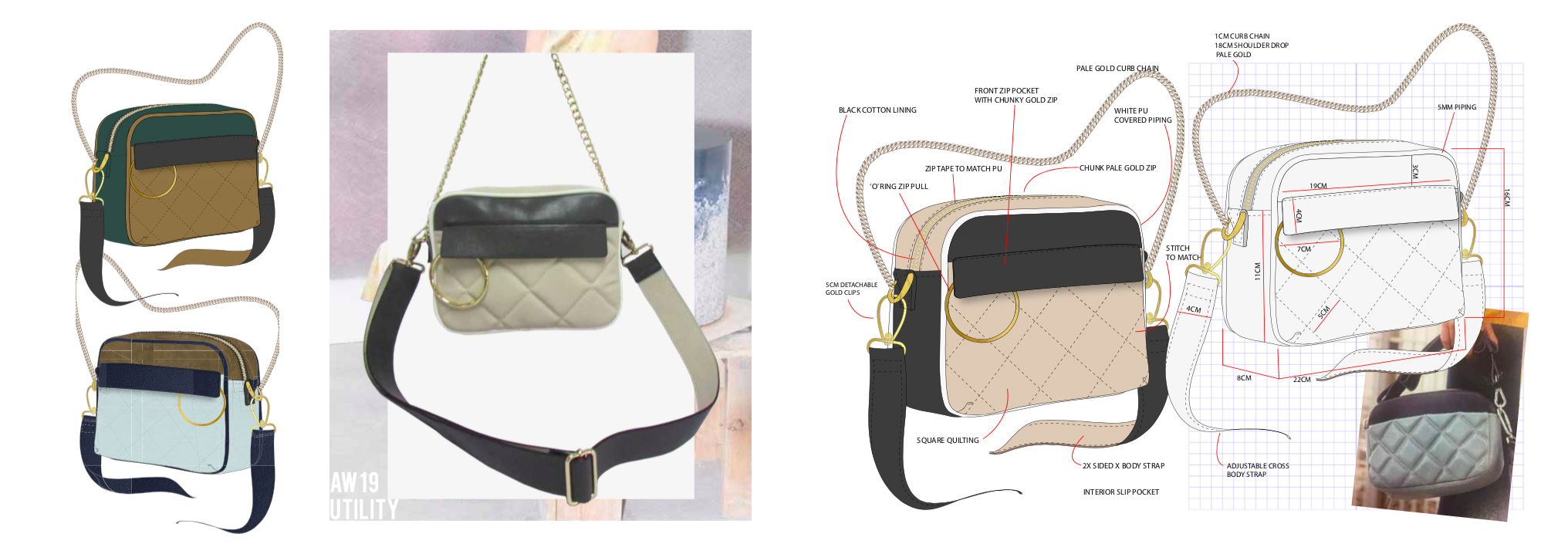 So, since I graduated in 2010, my job has been mainly an accessory designer. I have worked freelance and in large brands too, like ASOS and New Look. Though my specialism is handbag design, I have worked across a variety of products like jewellery, belts, soft accessories and small leather goods. The chance to broaden my skills whilst in work has been a really great thing. I am currently freelancing for a number of clients across product categories which is really exciting and keeps my days varied.