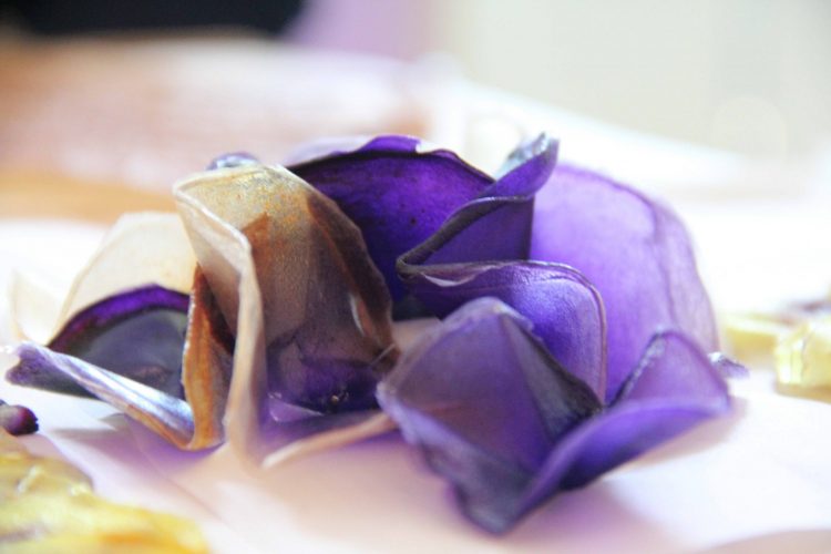 We developed a series of biomaterials from readily available food ingredients so that we could exhibit these materials in the form of swatches and fashion objects with the aim of seeing how the public would react to the prospect of ‘growing your own fabric’. We grew the biomaterials in our kitchen and then exhibited our work publicly at the Wellcome Collection and the Create Place.