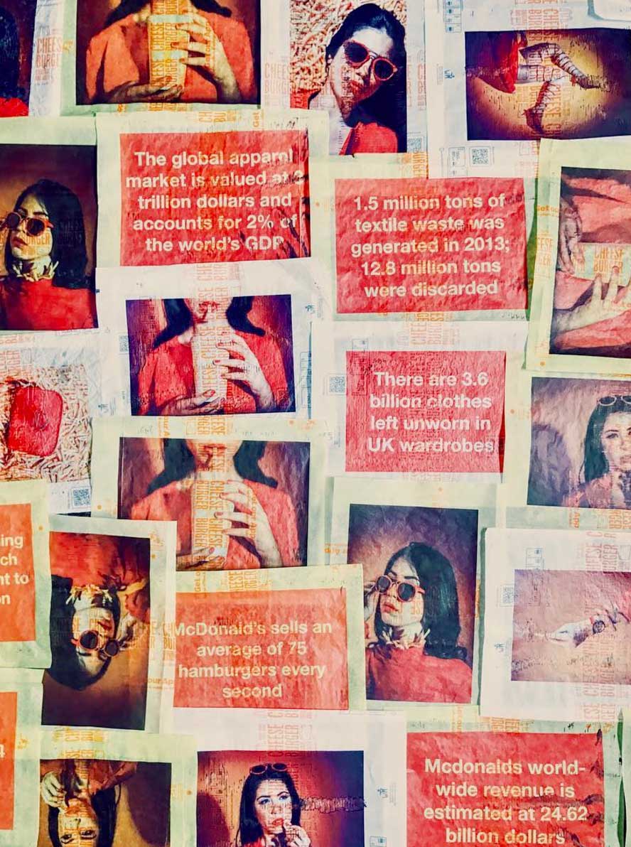GD: My master’s project is a continuation of themes I’ve been working with throughout my time at UAL. I’ve been exploring consumption, gluttony, and waste through connecting fast fashion and fast food. For my latest installation, I photographed a model with fast food and then printed the images onto hundreds of real cheeseburger wrappers from fast food stores. I want to continue on that path and make public street-style installations of my work which will hopefully make it more accessible to anyone walking by. I also want to look into scanning and screen printing my images.
