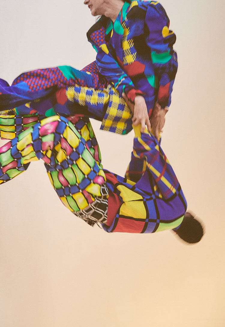 (Above): printed suit in viscose and cotton, (Below): multi-colour knitwear and printed trouser Gianni Versace circa 90’s. Photography: Hugo Yanguela