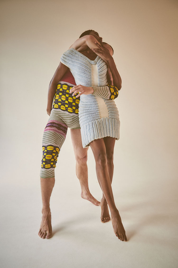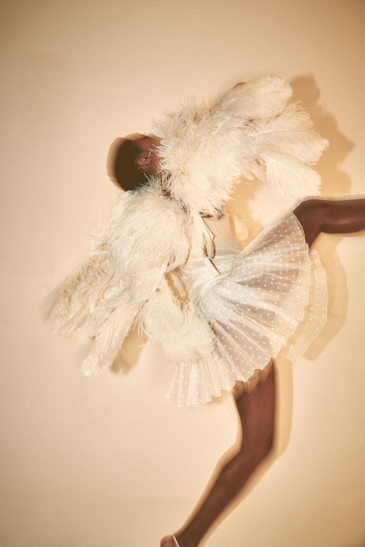 Above left: Knitted chenille ‘Houpette’ dress, Azzedine Alaia 1992 and Vintage knit replica Ziggy Stardust asymmetrical bodysuit, Unknown circa 1995 Above right: Cream ostrich feather cape, Gucci S/S 2012 and White polka dot silk organza kilt, John Galliano S/S 1996 ‘le Papillon et la Fleur’ Photography by Hugo Yanguela