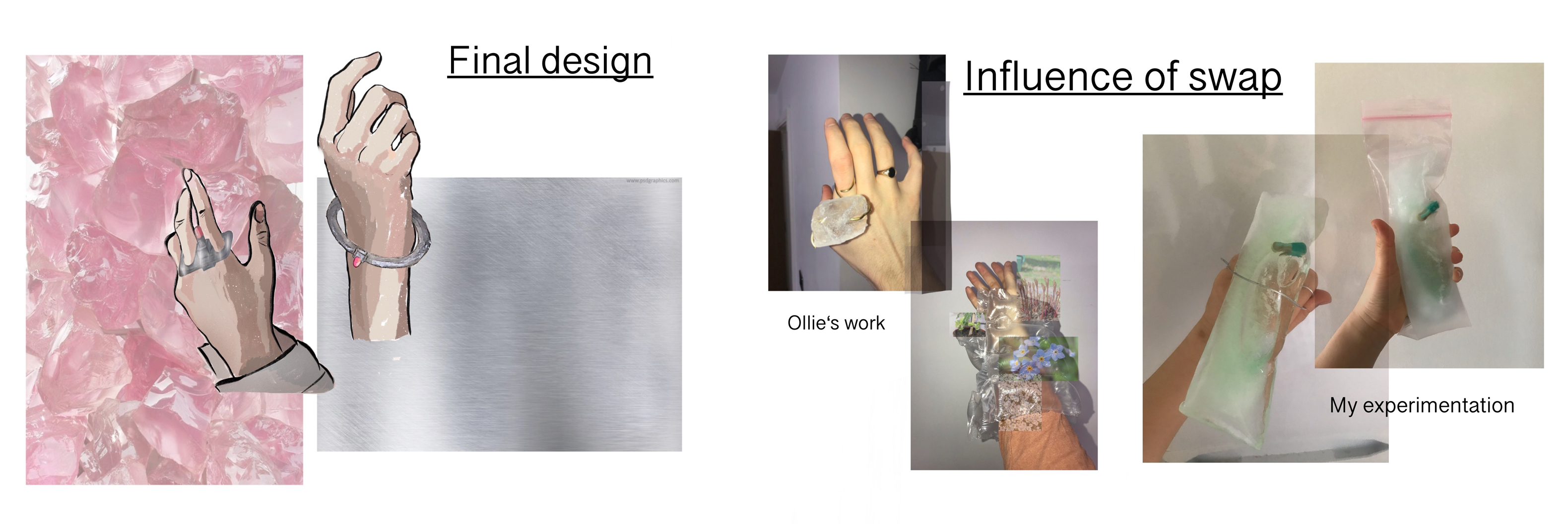 L: I was stuck with designing pills and earring before the swap. Ollie’s work made me consider the positioning on the body and the use of ice to evoke the idea of climate change. I didn’t use real ice in my final designs, but my material choices and textures were inspired by Ollie’s ice ring and air bangle.