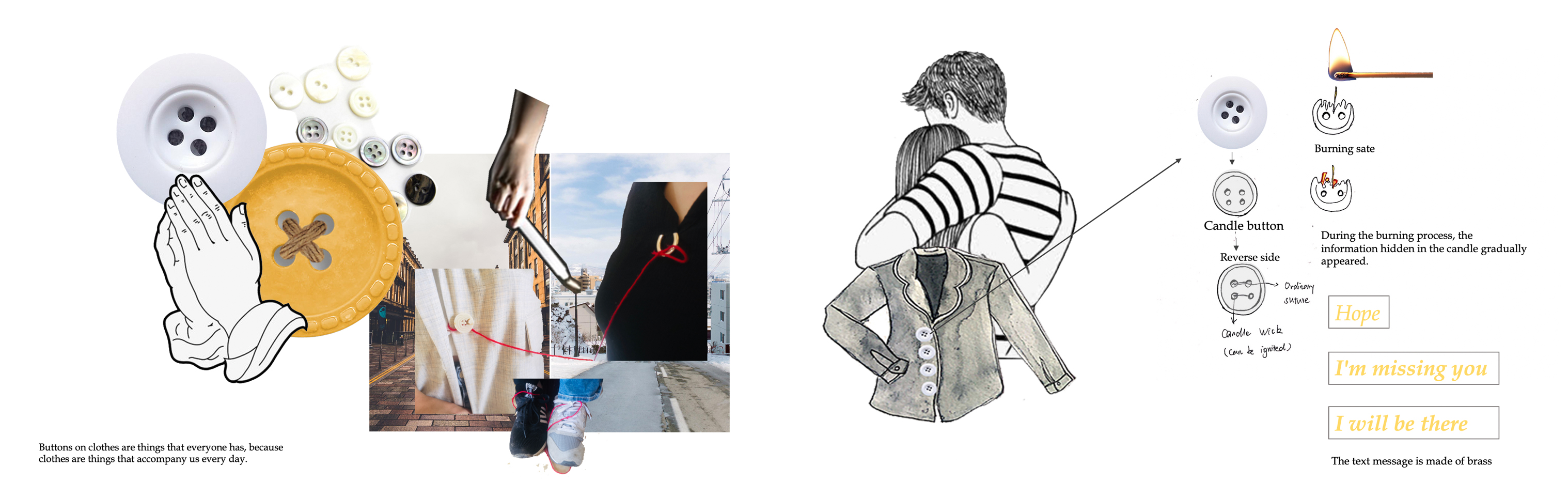 M: I had an in-depth discussion with my partner Kiki on the topic and design direction of prayer. At that time, I was not sure about the direction of development. Kiki suggested why I did not try to associate prayer with objects, such as Say candles, or other objects. Various developments. So I conducted a lot of physical experiments, and finally found that the buttons can be connected during the experiment. As the wax candle buttons melt through the wick thread that holds them to a garment, tiny wire messages within are revealed.