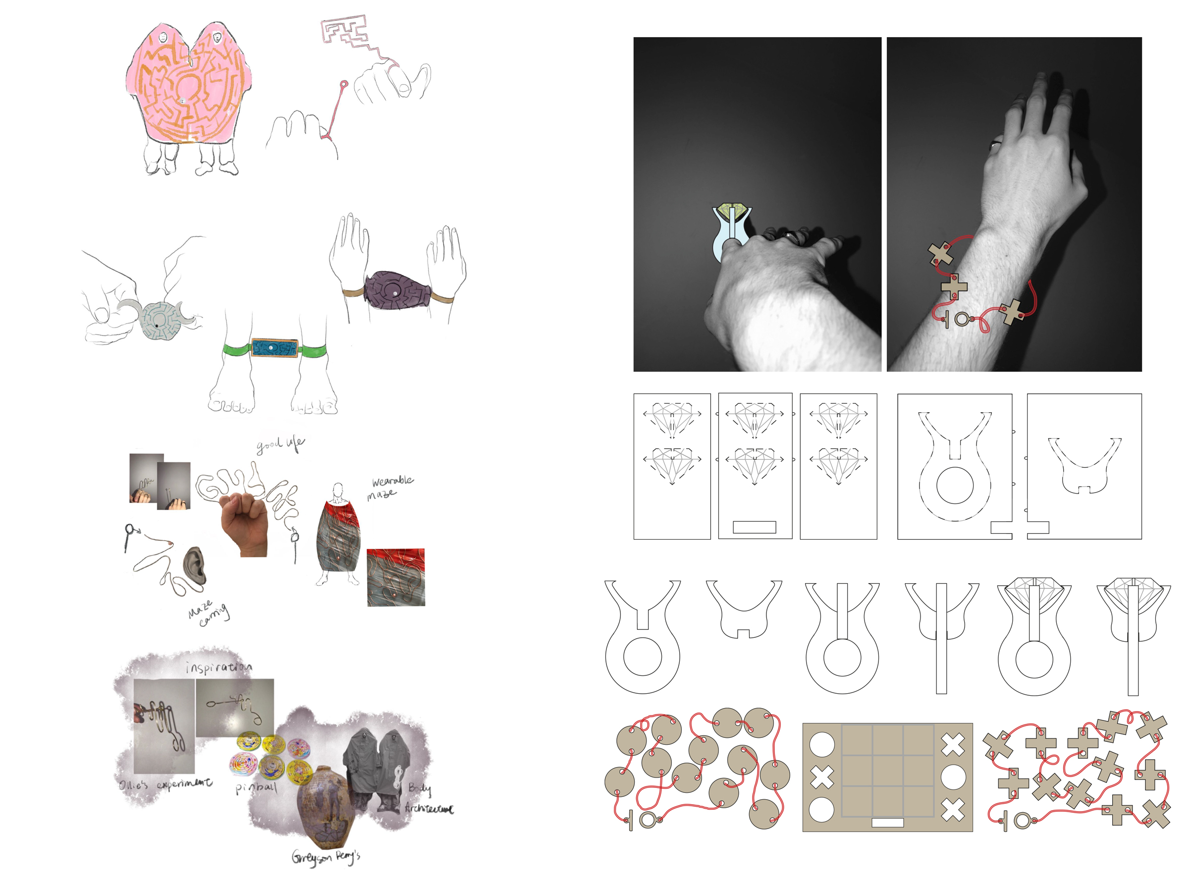 O: Through the swap and following, our project looked at an interaction between two or more different wearers. A piece of jewellery that required another piece of jewellery or another person in order for it to become interactive. This moment lead to experimentation of splitting games, having pieces of jewellery that could be worn by multiple people and pieces of jewellery that needed other parts to be complete. A sense of community, sharing and collaboration were key ideas that were tried to hold throughout design processes.