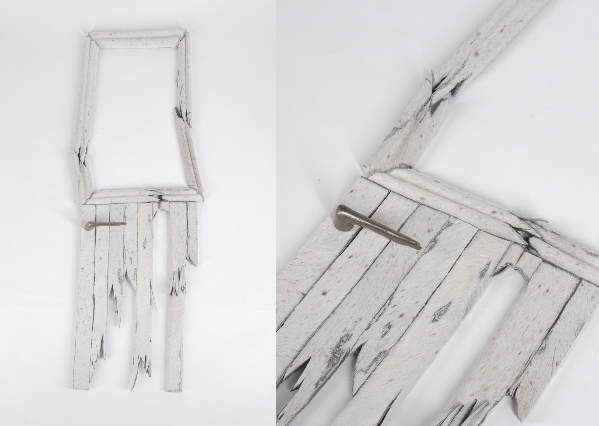 CHIN: My favourite project was inspired by an adventure ‘junk’ playground. It was original made by children during the Second World War, when they didn’t have toys or a place to play. At that time they were meeting together and collecting old things like cardboard or pieces of bombed cars. Although adults will treat it like junk, the children think it’s a valuable material. I tried to find real waste items, like old tyres or furniture and some wood pieces or broken sticks on the street to make special artefacts and wearable decorations. I used some luxury materials that look like leather and fur to make an original object. I like to combine things which have opposing ideologies, like the material of valuable items and the shape of junk.