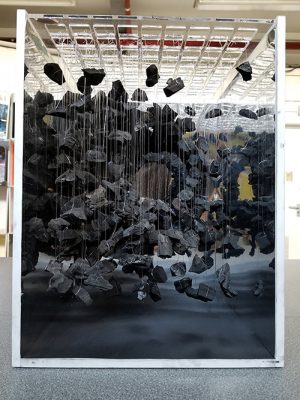 Before the end of our meeting, Ammar proudly shows me his first term’s first project, where he designed a concept for a retail space and its window display. The concept revolves around refugees’ (fake) life jackets and rubber boats, which, left on Greek island’s shores, are at once a trace of a present collective pain, and a threat for the future of the environment. The image shows charcoal stones floating in front of a dark hole situated at the bottom of the window. It’s full of gravity and emotions, and it reveals the indelible marks of a tragedy that is affecting many in the world, a tragedy that no one should remain indifferent to.