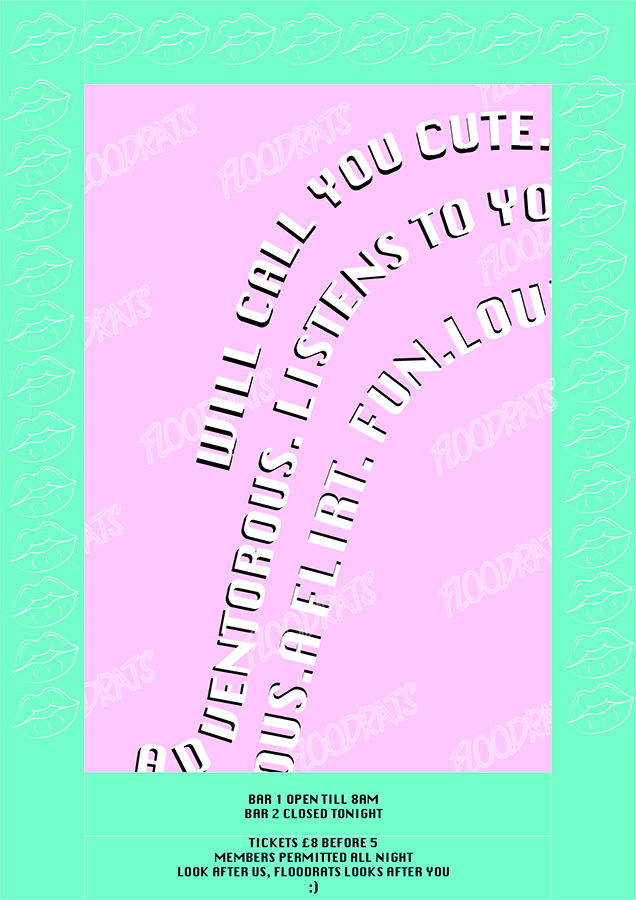 For my final major project, which has been my favourite at Wimbledon, myself and Coventry based musician, Sean Flood have collaborated to tell a live-action story based on an animated worlds rules. It explores the ideas of misogyny, gender roles and feminism, whilst lightly touching on substance abuse. By using the world of animation as a basis for my worlds rules, I have been able to do so in an inviting, fun and colourful manner. The story is written by Sean, who just so happens to be one of my closest friends. The story follows our Wolf, the concept of the Wolf is like what you see in ‘Little Red Riding Hood’ and in Looney Toons cartoon classics. Sean and I have worked for the past year to mould our own take on our Wolf. He is a slapstick take on the most basic boy you know…give it a think, now amplify that, that’s your Wolf. I have added my own flair to the project by ensuring it was as most a female a cast as possible and that they showed self-expression in every way. We have created, Floodrat, which is a state of mind, not just our fictional club in the script. It’s about knowing who you are and staying true to that.