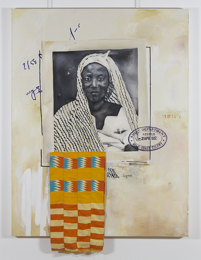 One of my pieces, there is acetone transfers on linen. My work takes different forms, most of the time it’s paints, but it has some sort of ink movement from one place to another – like the passports and also my personal relationship – as in me moving to another country and me losing some sort of identity or culture, because I’m not the same person as I was in Ghana. In Britain I am very much Ghanaian and in Ghana I am very much British, I am always straddling between these two identities and so I use transfers a lot to represent that sort of loss. When I transfer something on to another piece the ink is no longer there, some of the information is lost, playing around with those kind of ideas. There will be transfers, linen, sculpture.
