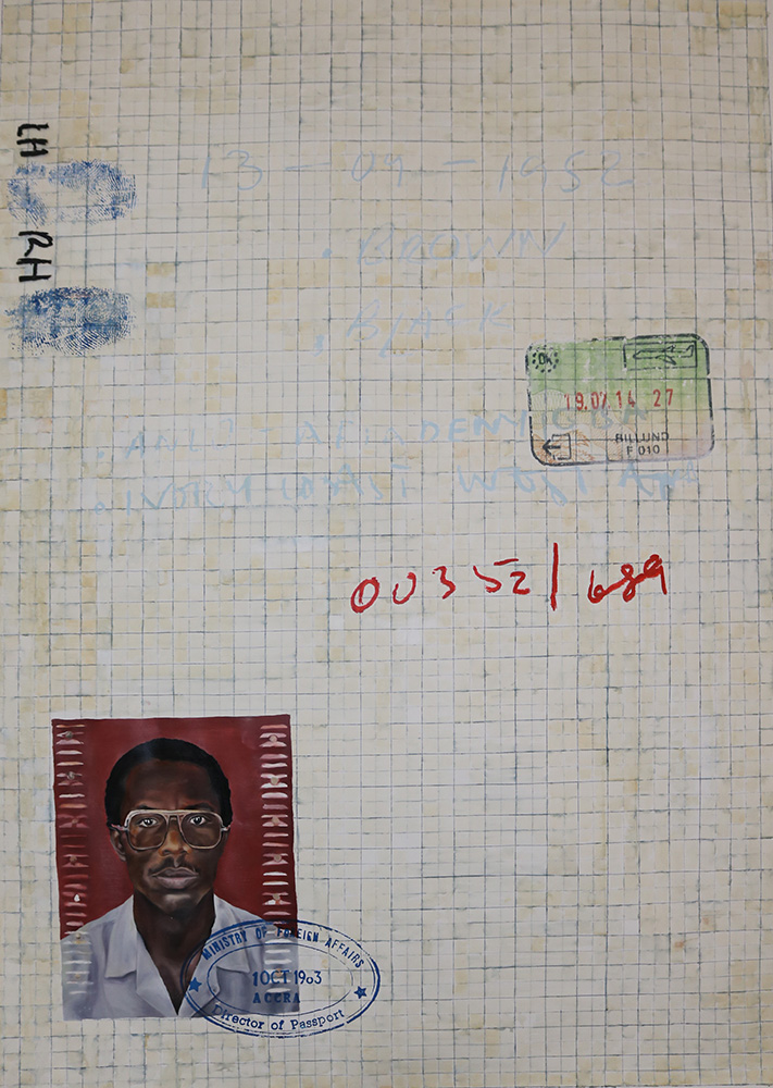For me I was looking at West Africa, as that’s the only place I can speak for because that’s where I’ve lived. Africans moving within Africa then crossing, then walking on land before they cross the sea, what happens before, what happens at the checkpoint, what happens with their passports, with their documents. Instead of what’s happening now, I try and look back, looking at what happened before independence, during independence and after, really thinking about movements that Africans made before these big historical times in West Africa and Ghana. I went to archives, I went to one in Ghana and I go through peoples Passports and documents to see the kinds of movements people made. For example in 1950 what were the popular places that maybe Ghanaian people liked to travel to? Through that research I could see there was a lot of movement within Africa. Usually when we talk about movement in general we almost always normally talk about African to European movement, but there is a lot of movement within the continent. I think that idea of African to European movement stems from people addressing Africa as a country as opposed to a continent. Each country has its own boarders and they are treated differently. Although we are friendly with each other and we don’t build big walls, there are still conflicts. There have been deportations, the same things that happen in Europe could happen within Africa. Those are the sorts of conversations I am trying to get out within my painting. So I mostly work from archives, passports, identification cards.