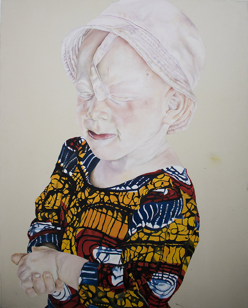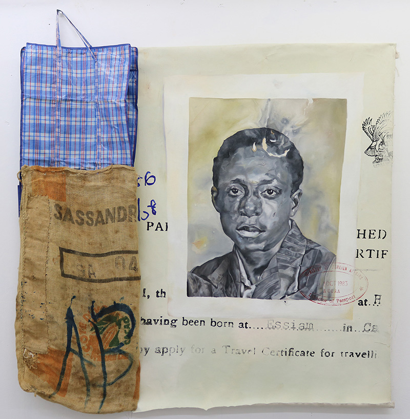 There is a number of works from the series of inter-African migration and hopefully albinism series. One of the works has a jute sack to reference commerce within Africa. Africans know that they trade within Africa, but what a lot of them don’t know is that they have refugee camps hosting other Africans in their own country. So for me it was to highlight, oh look we can talk about trade and we can talk about agriculture, but do you actually know you have refugees in your country? I had no idea we had refugee camps. Usually when I go to Ghana, I sit in the taxi and I talk to people and it is so clear that the majority of people have no idea about human movement within their own country.