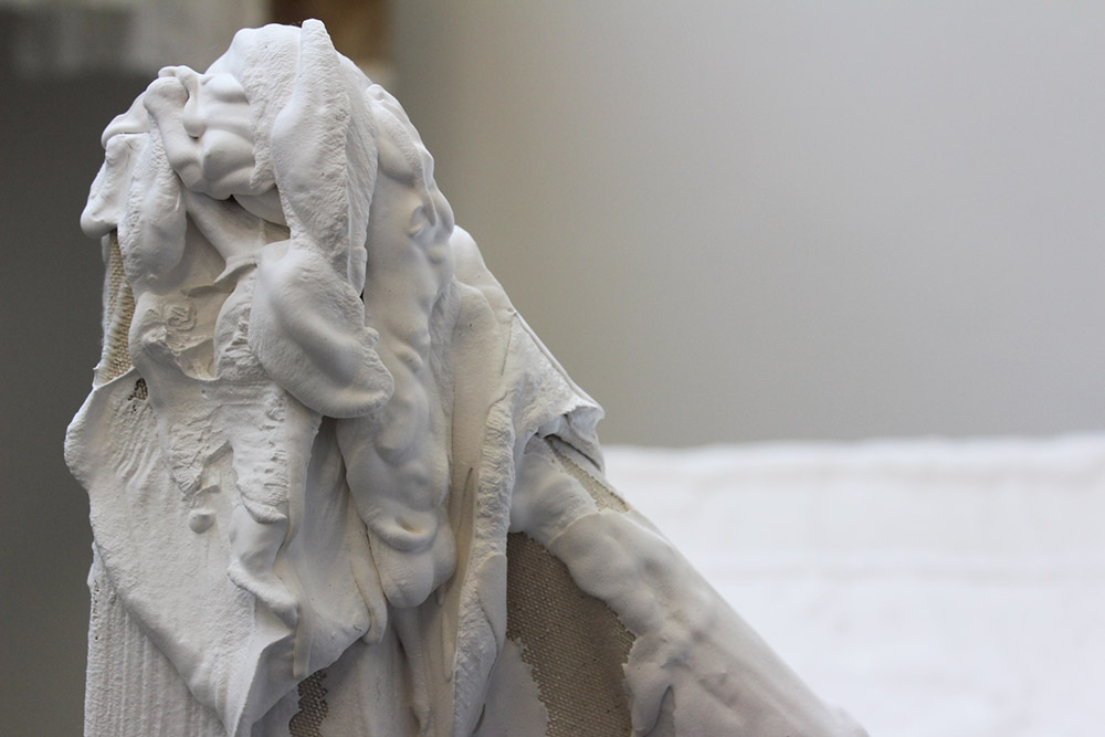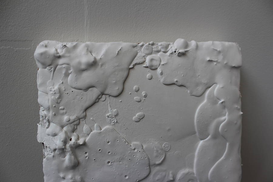 My practice has changed with every project I’ve done. As I said, when I started I was more into photography and collage, I then quite quickly moved onto screen printing and using the printing facilities. In first year I was doing a lot of screen printing on acetate and working with lights. I made little acrylic cubes and shined light through them. In second year I was all about plaster and dirt, I decided that all my work was about dirt. I made a video where it was me and my house mate covering ourselves in clay, mud and human hair. I shot that over a sculpture I made of wood, fabric and plaster. After that I moved into more rubbery materials and made resin cubes – which is really dangerous! I was in search of a clear material, this is when I moved into silicone rubber and liquid latex, making floppy sculptures. My work started to become very geometric. Silicone is expensive and I really like it as a material, but unless you have accurate casts, silicone is very difficult to get it in the shape you want. My style of working is quite fast paced, I do each piece quite quickly. I don’t want to spend too much time on something because then I find half the concept is gone. I like materials, so I went back to plaster and I’ve been working on stretched canvas, dripping the plaster onto the canvas, keeping it in its liquid form so it dries up drippy. Mainly I like working with liquids that solidify. All my work has been heavily conceptual, I have always explored the same thing which is the human relationship towards art and the question, “what is art?”. The medium comes after, it’s more about my response to the research. I do really like just playing around with found materials.