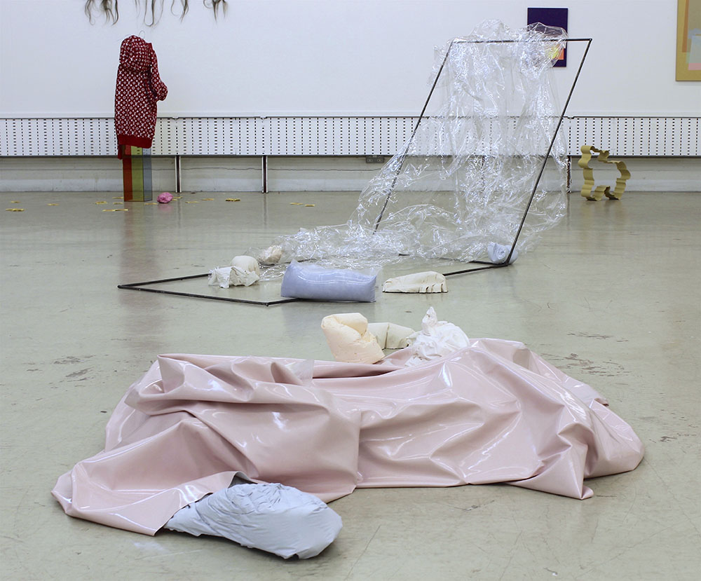 Eva Hesse is a big influence for me just in terms of how she moved from painting to object making and these hanging sculptures she has done. It is very bodily in the same way that my work is, I really like using her as a reference when I make work. Karla Black, who is a contemporary artist, she uses PVC and pastel colours, which I use as well and integrate into my work. It is really nice seeing her work and how that can influence mine and what I can take from it.