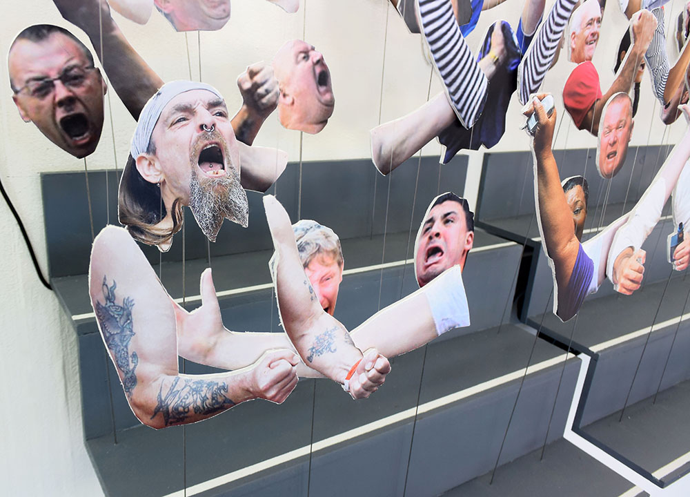 ‘GET IN’ (2018) (exhibited on the opposite end of the room) is a kinetic installation that replicates the monumental moment when a football team scores and the crowd celebrates (very conveniently timed alongside the World Cup). It features two football stands from which football fan heads on wires stand upright. Above are two hanging structures holding the football fan’s arms, which lift up and down via windscreen wiper motors. When the arms are pulled to their highest point they align with the heads in a brief moment of celebration until they drop again and repeat the cycle. As an Artist who explores what it is that makes us human, a football crowd can bounce from one end of the euphoric scale to the other. Football isn’t necessarily represented or questioned very much within the art world but why not? I am an Artist who goes to galleries but I am also a football fan who goes to matches. If sport is engaging with such a wide spread of society maybe the art world could tap into this appeal.