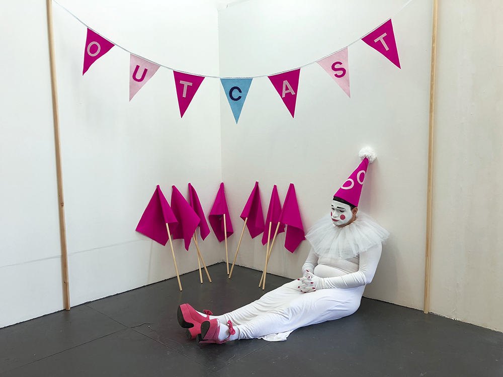 Queerrot (pronouns: they/them), was the character I used exclusively for the degree show. They are a queer mime who marries my passion for queer theory and culture with the long tradition of commedia dell’atre: a genre of improvised street theatre. Queerrot’s perpetual pursuit of company allows me to venture into what I call “partycipation”: a fun way to engage with live art audiences through the use of props, whilst also instigating a conversation about the relation between queerness, solitude and marginalisation.