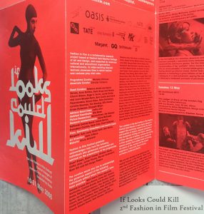 April’s display at London College of Fashion Library looks at fashion in film in our Special Collection. The first part of the display focuses on texts and ephemera generated by the Fashion in Film Festival. Fashion in Film is an exhibitions, research and education project established at The Horse Hospital, now based at Central Saint Martins. The festival has close links to us here at London College of Fashion. They describe their work as “At the heart of our mission is archival and scholarly research, combined with accessible and wide-reaching debate.” [1] The first festival Between Stigma & Enigma was launched in 2006 described as a “project exploring the common ground shared by fashion and film.” [2] Which presented “a mix of early and classic cinema, contemporary art, as well as documentary, instruction and propaganda film.” [3] The second festival If Looks Could Kill took place in 2008 exploring “the compelling links between cinema, fashion, crime and violence. Tackling themes such as disguise , the expression of desire, juvenile delinquency and the corruption of beauty, the festival features a string of underworld characters and their prosecutors whose highly effective costume, styling and sartorial gestures helped define cinematic genres from detective to thriller, gangster, film noir and horror.” [4] The third festival Birds of Paradise in 2010 was “an intoxicating exploration of costume as a form of cinematic spectacle throughout European and American cinema.” [5] Part of the festival was Kinoscope Parlour a London based installation of six peephole machines at twelve different locations “a contemporary re-imagining of the kinetoscope invented by Thomas A. Edison and W.K.L. Dickson in the early 1890s.” [6]