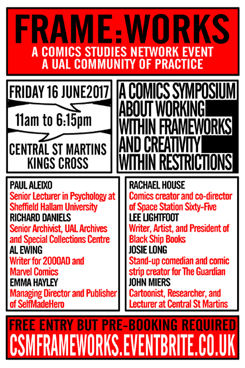 On 16th June our Senior Archivist, Richard Daniels, will be presenting at a one-day symposium on comics studies at Central St Martins alongside a number of academics, practitioners and professionals. The panellists will be discussing the ideas surrounding working within frameworks, and Richard will be showcasing our comic collections, including the Les Coleman Collection of underground and alternative comics. Other speakers include Al Ewing, Lee Lightfoot and Josie Long.