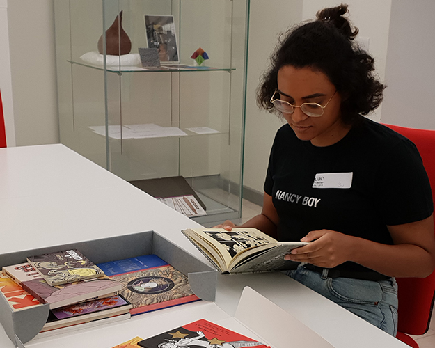 Volunteer Clara cataloguing single-issue comics from the Les Coleman collection. (c) Robin Sampson