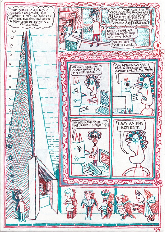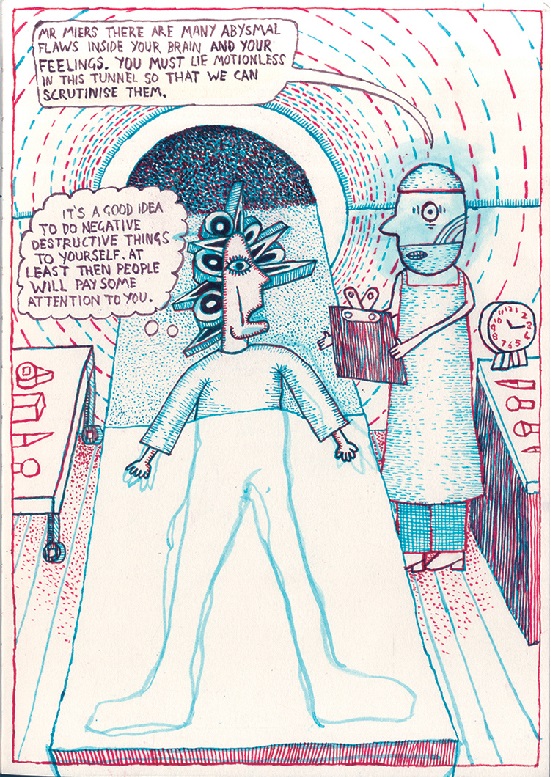 So I began to form a plan in which I’d look for work that offered a register that I could employ to discuss different aspects of coping with MS. An artist I’m currently working with is Mark Beyer, whose work appears in the avant-garde anthology Raw and a number of hardback collections in the Coleman Collection: