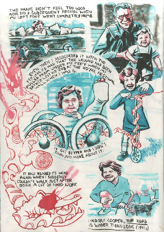 Lindsay Cooper’s archive contains extensive written material, including diaries and texts intended for publication, some of which discusses having MS. The drawing below uses childhood photos of Cooper to illustrate a passage from her diaries: