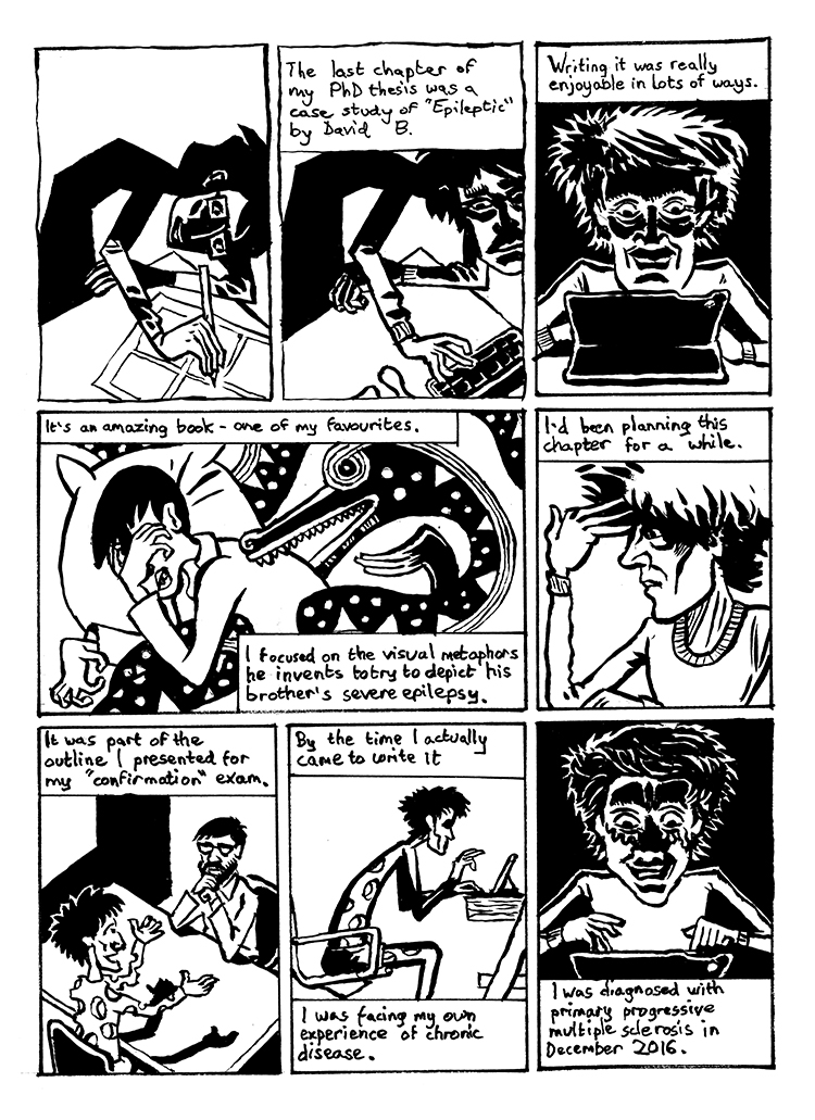 Unsurprisingly, the question of how artists can use narrative drawing to conceptualise and express traumatic experiences of disease took on an acute personal salience while writing this chapter. I didn’t mention my MS in the thesis, but I knew that I wanted it to be the focus of my next project.