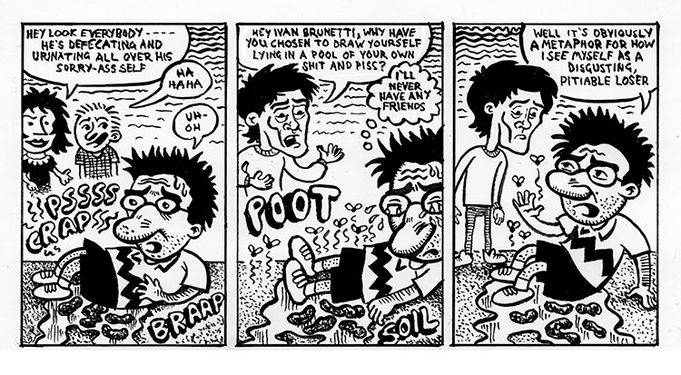 Here, Brunetti’s fictional loss of control of his “excretory functions” is a metaphor for his real problems with social anxiety. It’s almost a complete inversion of my own experience: I’m fortunate not to suffer from the kind of anxiety Brunetti expresses here, but the fictional vehicle he uses to communicate it does describe a common symptom of MS. The first drawing I made for the project saw me “invading” Brunetti’s comic: