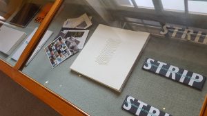 The display at Wimbledon highlights the Art Ephemera Collection, part of the Special Collections at Chelsea College of Arts. The collection includes a large range of printed items such as clippings, press releases, reviews, private view cards, artists’ statements, CVs, invitations, correspondence and posters relating to artists and galleries. It is constantly being added to and is a source of information on new and lesser known artists, and the gallery scene in the UK, from 1950 to date. It is primarily comprised of British ephemera, with a small selection of international material. London-based artists and galleries are particularly well represented, and Chelsea College of Arts staff, students and alumni are pro-actively collected. Current size of the collection is approximately 30 linear metres, with many thousands of individual artists represented, of which ca. 700 are listed (those with more than 5 items of ephemera). Collected as primary sources of information (images and historical data), in many cases the sole existing ones, they are also valuable as artefacts, for their material qualities, and often used as such in exhibitions.