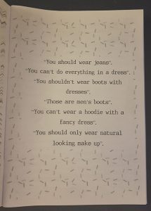 I usually have a general idea of what a particular zine is going to look like (text dense, more pictures, etcetera) in the planning stages. I run my ideas by my sparring partner (that would be my mum), and adapt my ideas incorporating some of the feedback I get from her. Then I start with the actual work: I either cut and paste the zine by hand, use Scribus or (don’t tell anyone) use Word – whatever gets it done, basically.