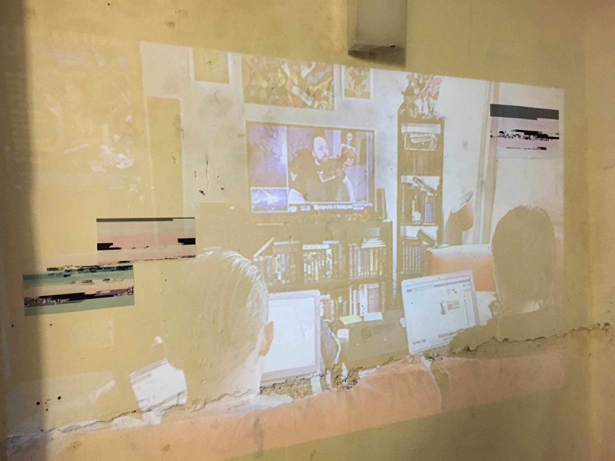 ‘Glitch Us’ is accompanied by another video being projected on the adjacent wall, which bares the image of a young couple – a man and a woman to be precise, chilling in an interior setting. The camera is set behind a sofa, so the sitters have their backs turned towards the audience as they indulge in an intimate affair with technology: A flat screen TV is on at the background. Each person has a laptop sat on their laps as they fiddle with other portable devices such as smart phones and tablets. Are they paying attention at any of these devices, or even each other? This video titled ‘Voyer’ by Marley Treloar illustrates how contemporary technologies make people be ‘alone together’ in the words of Social Science Researcher Sherry Turkle, who argues that we are now more comfortable with digital intimacy than face to face interactions.