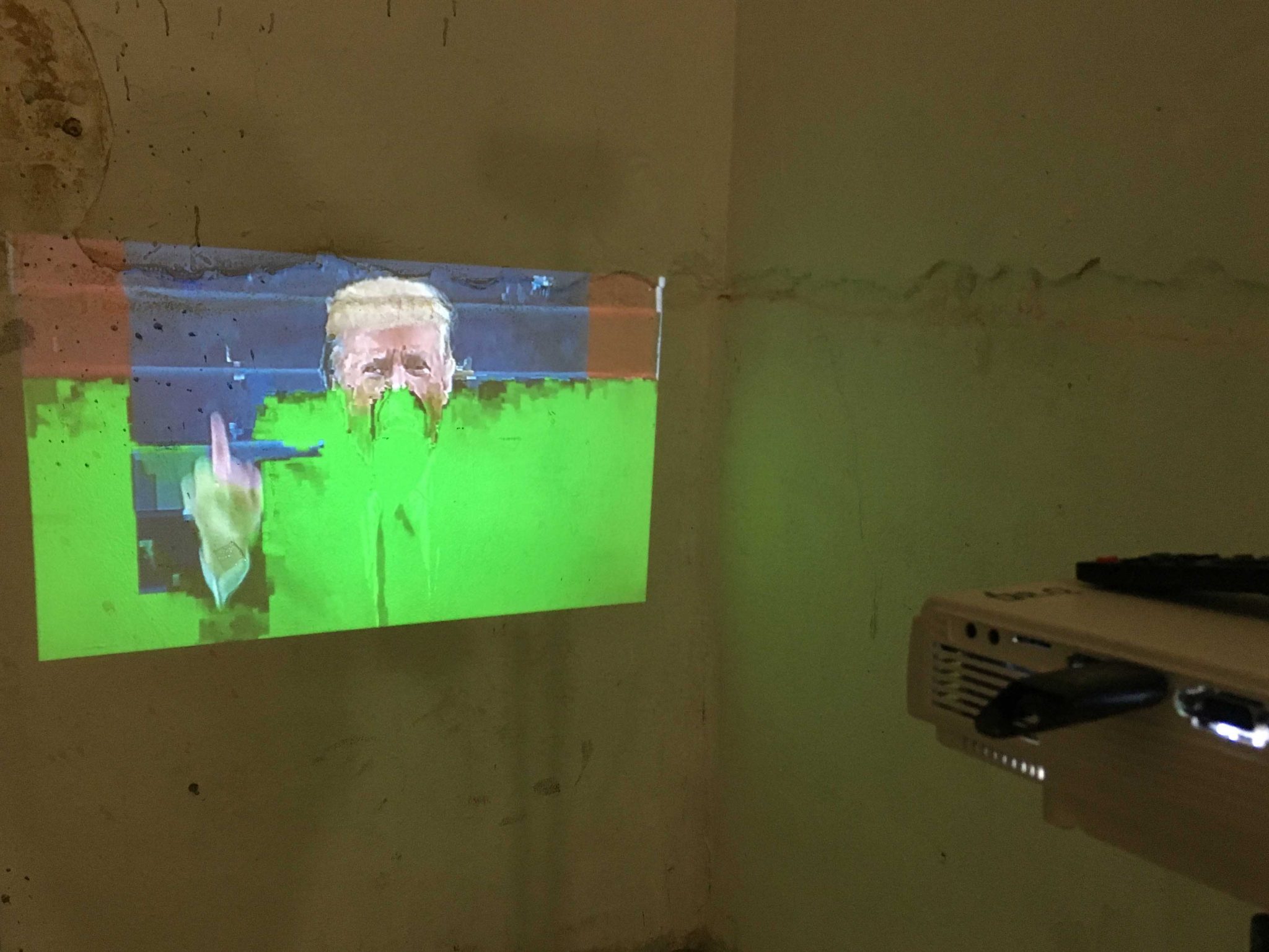 Whilst you venture further into the morgue, you are greeted by the unsettling sight of the current USA president, in a small-scale wall projection. This video piece titled ‘Glitch US’ by Joshua Evan comprises of a heavily glitched and slowed down version of Donald Trump’s inauguration speech, originally broadcast in January 2017. Trump’s voice echoes like the screams of a poltergeist trapped in the morgue, whilst the image of him moving on a glacial pace conjures up the trauma brought about by the most recent US presidential election.