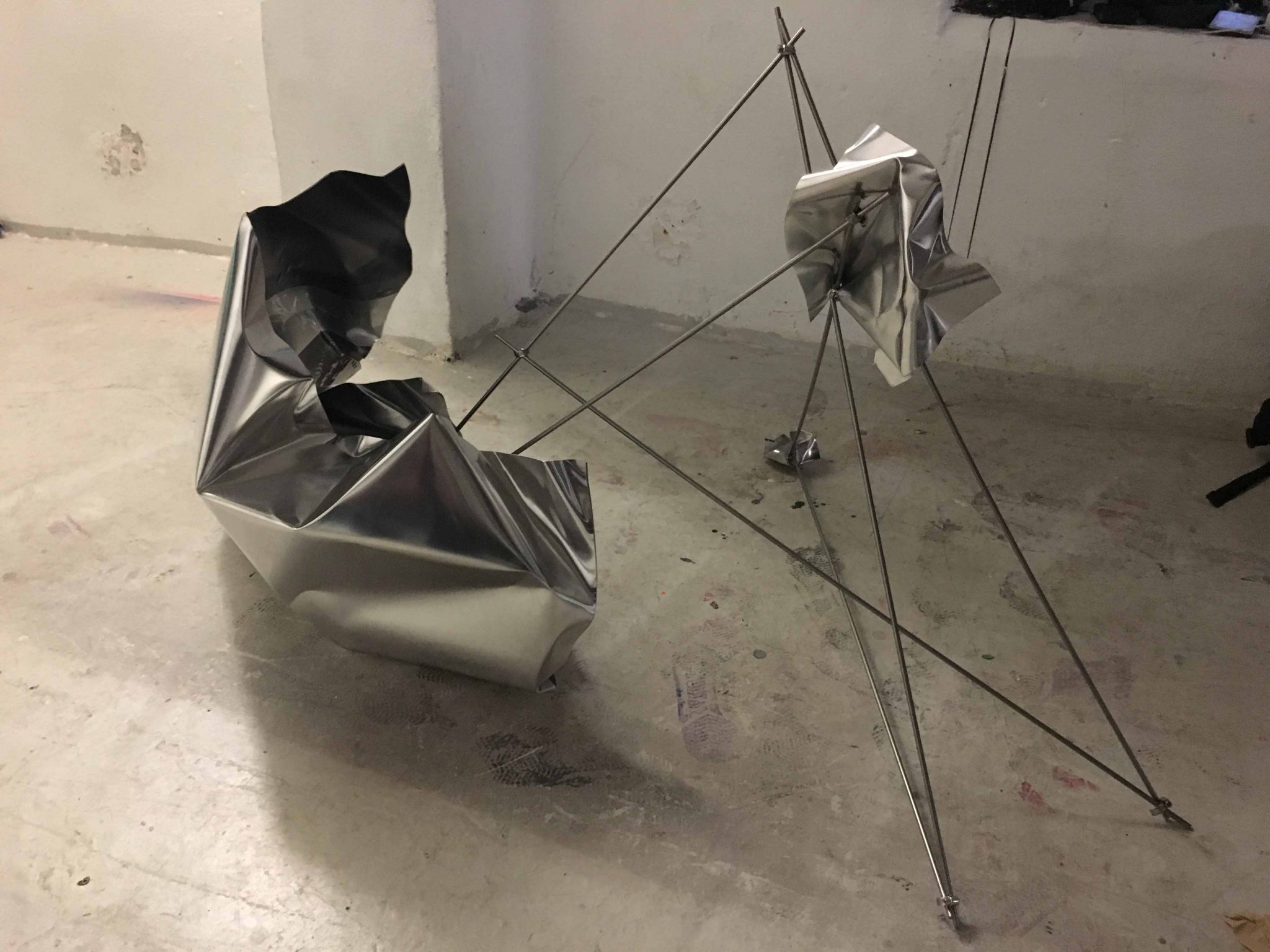 As you enter the space, you immediately notice a plethora of structures resembling scrunched up pieces of paper laid on the floor. On a closer inspection, the viewer discovers that the small pieces of paper have been treated with some sort of wax, making them stiffer. There are however some aluminium sculptures, resting on structures made of metal rods – which are roughly 10 times the size of their life size counterparts. These are titled ‘Next Macintosh v1.3 and v1.4’ and both display distorted images of backgrounds on their inner surface. It seems that their maker Marie Gerard has realised a physical metaphor for how digital data may appear once it is corrupted.