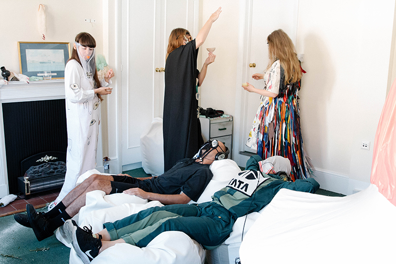 While the staff was primarily enacted by the artists, invited by Newall (including Antti Sakari Saario, Linda Persson, Cameron Brott and many others), the guests were “recruited” from the audience: those, who were interested to have a spend a night at Hotel Jaguar and exchange the experience in the morning — during the social dreaming matrix guided by Dr. Julian Mantley, one of Newall’s collaborators. For the sleepover (8 hours), the participants were dressed up in the costumes, designed by Newall — to be fully integrated into the environment that she created. In the morning after the sleepover, psychologist Dr Julian Manley ran a dream-sharing event, called a “matrix”, inviting the participants to communicate their real night time dreams, images, and associations. These dreams were not interpreted by the matrix conveners; instead, these were allowed to gradually accumulate and transform in the course of the matrix. In this way, the main purpose of the social dreaming experience — and Newall’s artwork accordingly — was to provide a forum for sharing the hidden or unspoken thoughts and feelings about the social circumstances of the participants, enabling them to create new perceptions of, and solutions to the world that they share.