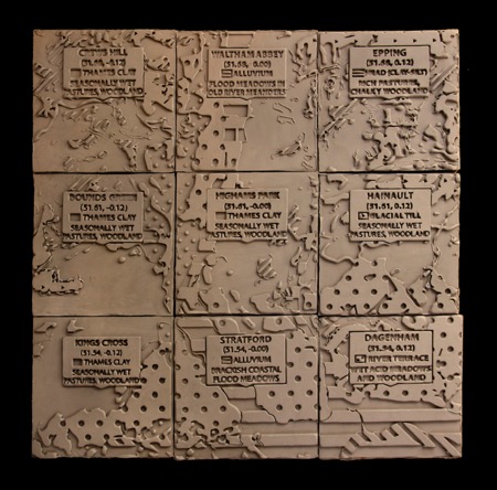 There’s a direct link from my practice in Joya, although my ambition here has been to access an audience beyond the limited confines of the art institution. I’ve made the work as sustainable as possible. The work shown inside the art gallery comprises dug-up earth samples from each of the nine points, collected via public transport and processed using recycling materials and tools (the ceramic works reduce the sustainability quotient). I’ve attempted to create a visceral and emotional experience, using earth which is drying, cracking and degrading over time.