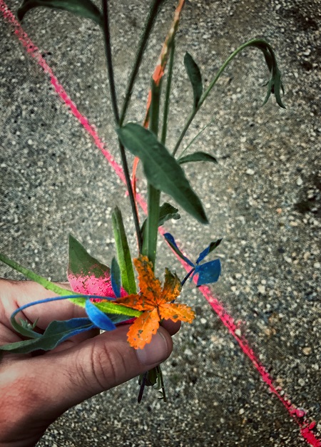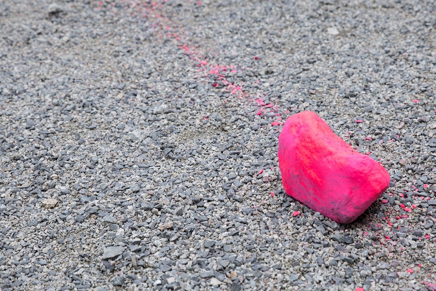 After painting them in bright pink, piece by piece, we carefully placed along the line.