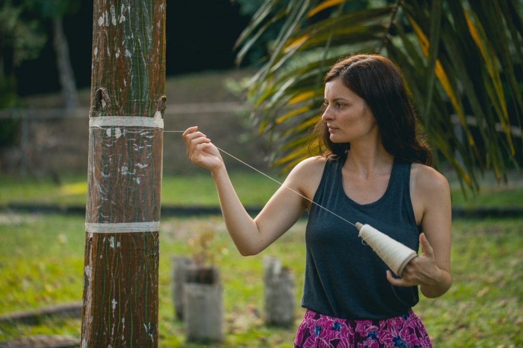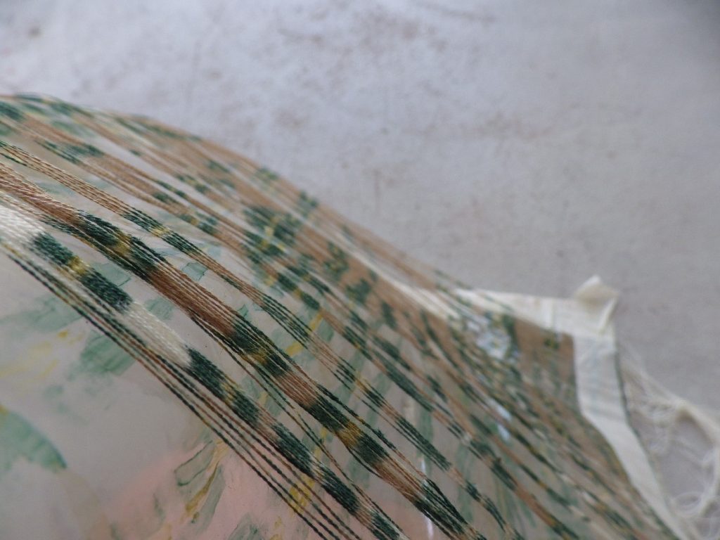 I wanted to find another way to record some of the interesting bark patterns I’d found in the forest. There was one tree in particular which had bright orange and green markings that I’d never seen before. I had some organic cotton yarn with me and wanted to mark it with the same colours and shapes from the bark of the tree. I had been thinking about warp printing (which is where you print the warp of a woven textile before weaving it, and once woven, it gives an interestingly abstract depiction of the print) and I decided to try my own version of it. I did this by looping the yarn around the tree trunk and then colouring the yarn, copying the markings of the tree. After cutting the yarn off my aim is to weave this back in the UK to see if you could still recognise the pattern from the tree and if there is value in this way of recording. This is something I am still keen to further develop.
