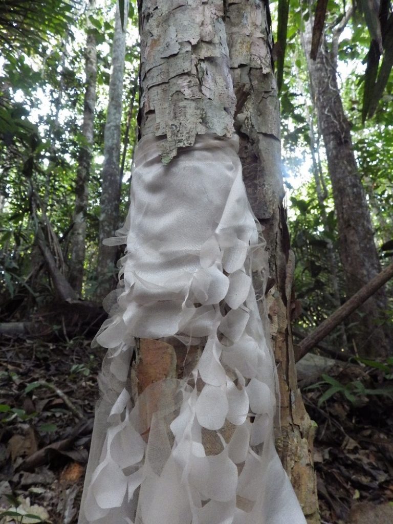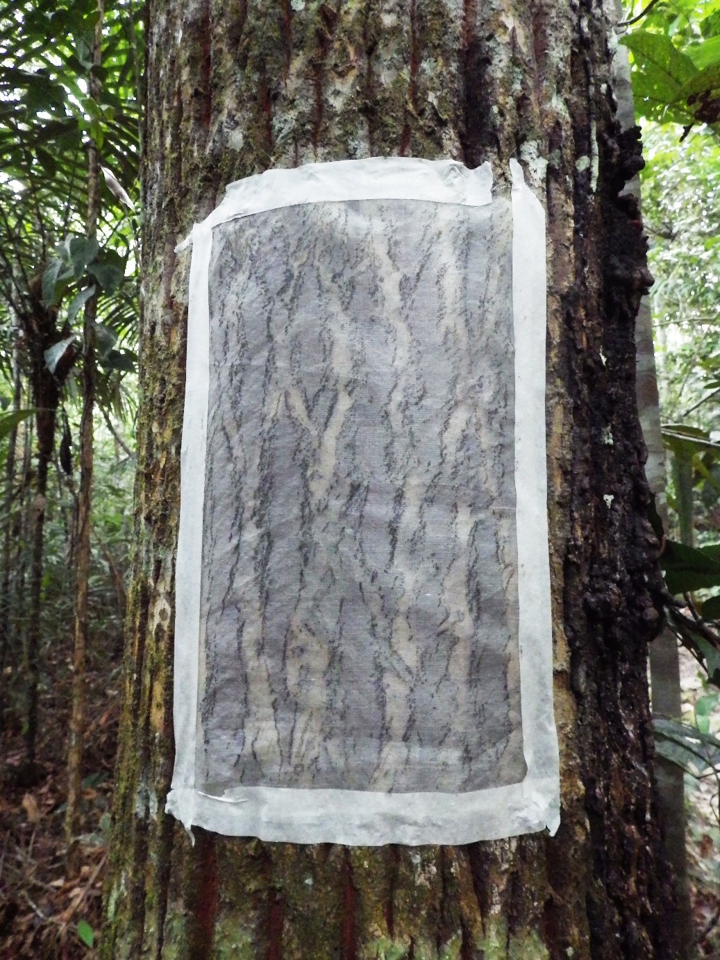 Charcoal rubbing onto silk in the Adolpho Ducke Reserve by Naomi Bailey-Cooper