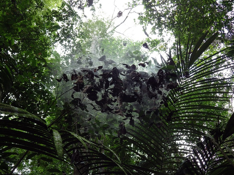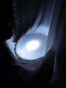 During the final days of the residency I continued to think of ways to document the forest through textiles. I had been inspired by an enormous spider web I had seen high in the trees and the leaves that had collected in it, and by the way in which scientists put cloth up underneath specific sites of interest to collect whatever would fall from the canopy. The impression it gave me was that whatever was falling was embellishing the fabric and that it was entirely unpredictable. I decided to set up my own experiment and hang silk in the forest in an embroidery hoop with a light underneath to see if it would attract insects. I left this overnight and came back early in the morning to see if anything had collected there – what had ‘embellished’ the fabric. Unfortunately, not much collected in that short amount of time apart from leaf parts, but I quickly photographed and hand stitched around those fallen pieces as a record for embellishment that I could further develop back in London.