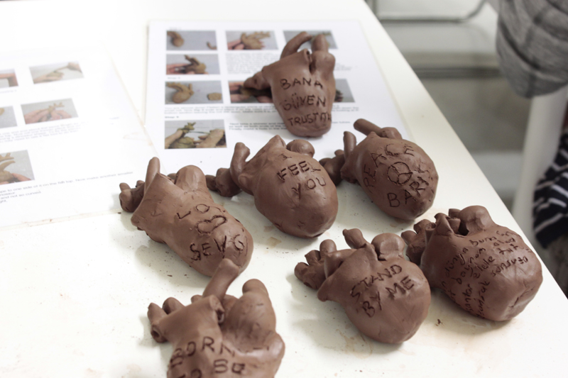 Hundreds of people answered Ryan’s initial call to come make hearts inscribed with personal messages while sharing their stories of migration, and expressing dismay at the current national and international mood towards refugees and migration. The resulting hearts were fired, wrapped in white fabric, and laid out in a labyrinth installment in Sydney on 10 December 2016, Human Rights Day. Visitors were invited to walk through the labyrinth and choose hearts to unwrap in a symbolic gesture of welcome. They were also encouraged to write a message on the cloth in response to the heart’s inscription. Ryan has now brought the workshop and installation to England with the help of Reading and Bjork, and for the past month, the trio have hosted longtime Londoners and visitors alike who’ve come to make hearts and share stories.