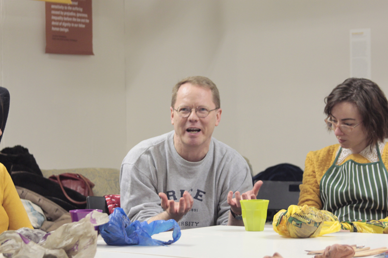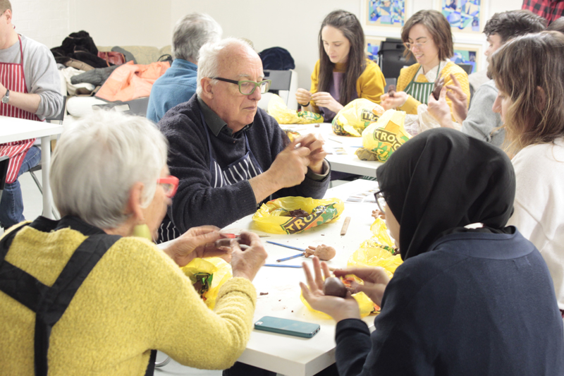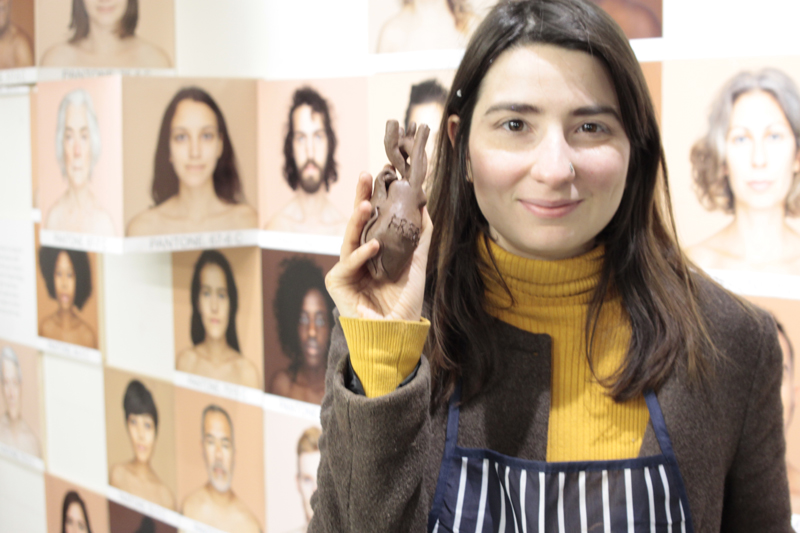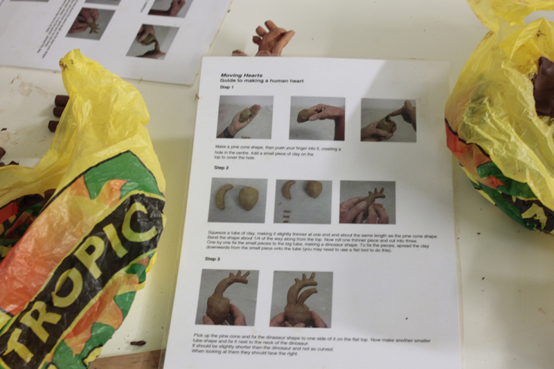 It was time to make some hearts: “We sweat into the clay as we make them, so you leave a bit of yourself into them.” Ryan said before leading us step-by-step into constructing the hearts, a process supported by assistants stationed at each table, and scored by the Choir With No Name’s concert recital in the Workshop below (at one point their rendition of “With a Little Help From My Friends” seemed particularly apt). After ensuring that we understood the process, Ryan moved around to have quick one-to-one chats with various participants. She frequently asked people to pose with their completed heart, taking pictures of them with her mobile phone.