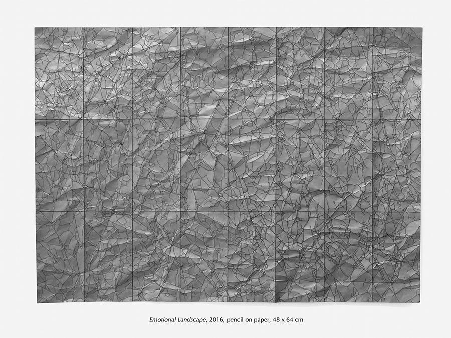 During my study at Wimbledon College of Arts in the MA Drawing programme, from which I graduated in October 2016, I developed a series of drawings called Emotional Landscape. These drawings are based on crumpled paper, and explore the discovery of value within something otherwise disregarded. This value seems to lie within the creative act, even if that fails. Embedded within the crumpled piece of paper are hidden the seeds of something new. In the first series of drawings, made on black paper using pencil, the shiny graphite began to resemble precious metal.