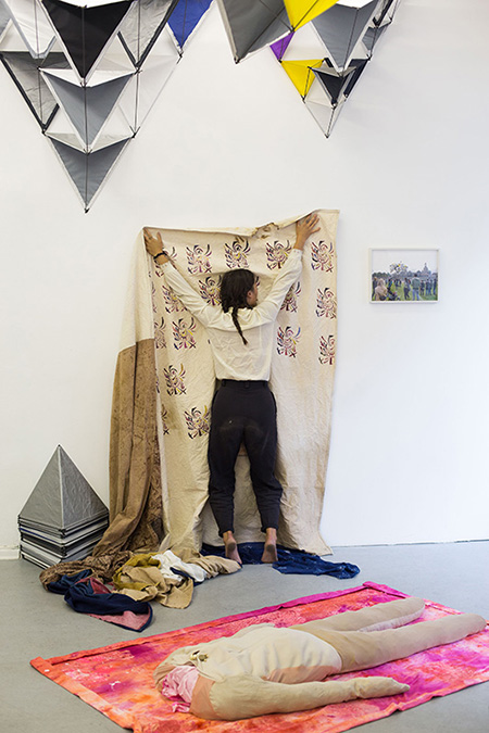 Raul Walch is known for his examination of public space and activities with local communities; he showed a sculpture inspired by islamic architecture, made with Syrian architecture collective Xero. Ukrainian photographer Valentyn Odnoviun re-accesses historical or socially engaged events and captures them forensically during on-site visits; his Traces of Memory looks into a former Gestapo prison in Berlin. Matteo Valerio’s textile wall installation was the result of working with me on a production interpreted by performer Lingji Hon. My own sculpture refers to my ongoing process with dancers, researches in philosophy and science, and my German-Polish-Lithuanian background; the work body axe (as per x, y, z) engages with inherited trauma.