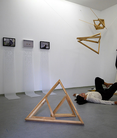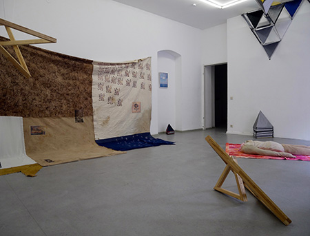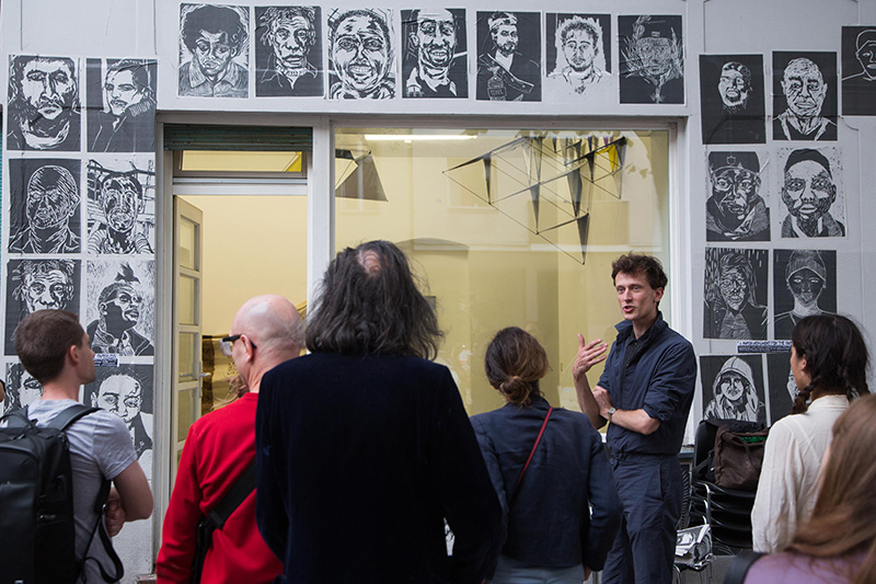 The works on show used our artistic potential, and established togetherness in times of dispersion through interaction, creation, involvement and research. The main exhibition was both inside and outside project room Rosalux. In the front of the art space, there were works by Domenique Himmelsbach de Vries, who challenges any idea of an exhibition by distributing his art in public spaces in the city, helped by fellow activists. Social artists Elisa Dierson, Katja Marie Voigt and Felix Stumpf developed an installation with refugee children in the project room Tiny Penthaus, in an old hotel now housing refugees, and some of that work was on show in the Rosalux room. Çağlar Tahiroğlu held an art-therapy workshop for refugees and migrants, and showed their work; her own exhibited installation, Journeys, was made in collaboration with refugee initiatives.