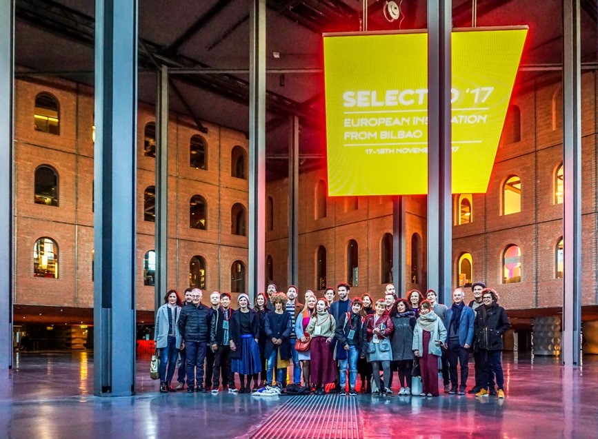 The unprecedented urban space, Azkuna Zentroa, serves as the city’s new reference point in the daily life of citizens. The big screen’s flaming sun visual was switched during Selected’17 to celebrate the two-day event and was the point all artists, designers, speakers and organizers gathered to take a photo before the press conference.