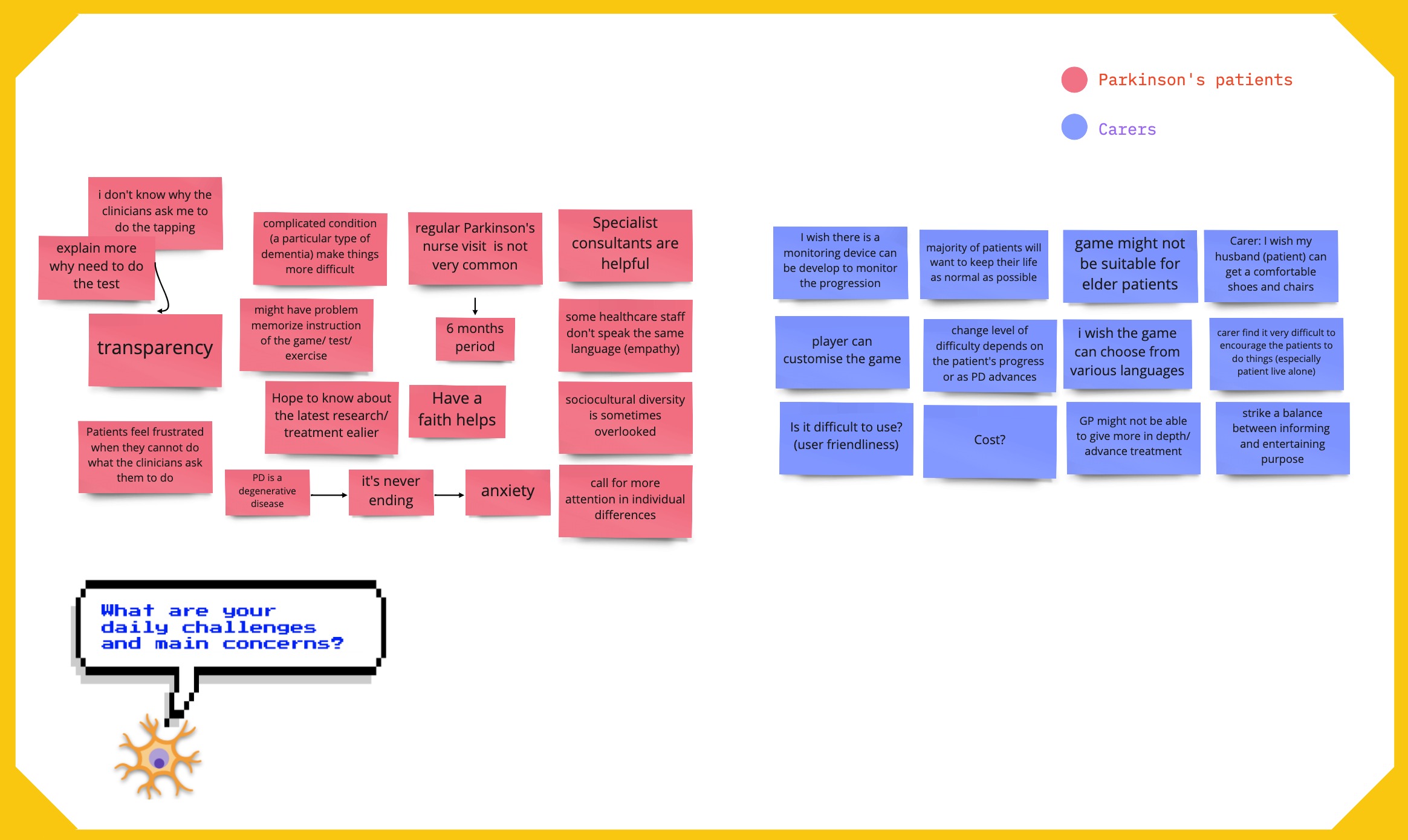 To begin with, we identified patient groups centred around the musculoskeletal remit of healthcare such as patients living with Parkinson’s Disease. From there we started to research online to learn about the common daily challenges faced by patients living with Parkinson’s. We discovered a repeating topic that emerges from the Parkinson’s community, in which the importance of emotional and mental well-being support of patients, as well as carers, is often underestimated. Therefore, we wonder “How might we improve the physical and mental well-being of patients with musculoskeletal diseases in the context of the new TENGs technology?” With this question in mind, we investigated the process of the existing clinical test that assesses patients’ conditions to see if there are any pain points or limitations that needed to be addressed