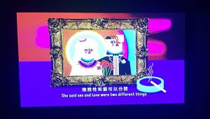 A narrative of truth can be found in Ryan Trecartin’s Item Falls which conduits our “anxieties around constructing identity” and in Al Solh’s work Now Eat My Script where the “narrator wonders whether trauma can be consciously lived, or even recorded in a non-voyeuristic way,” or in Wong Ping’s beguiling narrative, Jungle of Desire, where your sympathy eventually leaves you feeling soiled and questioning your moral judgements.